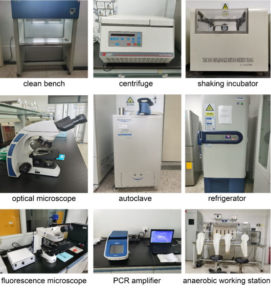 The microbiology laboratory is accompanied by clean benches, biosafety cabinet, water bath, microwave oven, drying ovens, autoclaves, centrifuges, optical microscopes, thermostat (shaking) incubators, refrigerators, fluorescence microscope, anaerobic working station, PCR amplifier, microreader, and other basic teaching and experimental equipment.