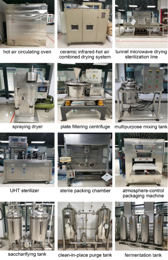 The pilot plant is equipped with various food drying systems, such as hot air circulating oven, spraying dryer, ceramic infrared-hot air combined drying system, and continuous tunnel microwave drying sterilization line, a complete beverage production line, consisting of extraction and concentration system, plate filtering centrifuge, multi-purpose mixing tank, UHT sterilizer, and sterile packing chamber, and a beer fermentation and product line, including saccharifying tank, filtering tank, boiling pot, whirlpool separating tank, fermentation tank, and clean-in-place purge tank, and grain storage and preservation tanks. It is extended further with other supporting equipment and 3 separate rooms for pretreatment and preparation.