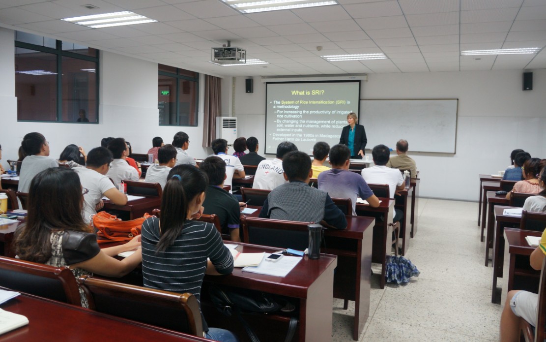 9月24日上午,我院在食品科學(xué)與工程樓學(xué)術(shù)報(bào)告廳舉行專題學(xué)術(shù)講座,特邀康奈爾大學(xué)研究SRI-Rice的項(xiàng)目負(fù)責(zé)人Erika Styger博士作《System of Rice Intensification》的專題演講。我校國際學(xué)院院長邱偉芬、我院副院長王立峰和部分教師、全體在校研究生參加了講座。講座由國際交流處處長邱偉芬主持。