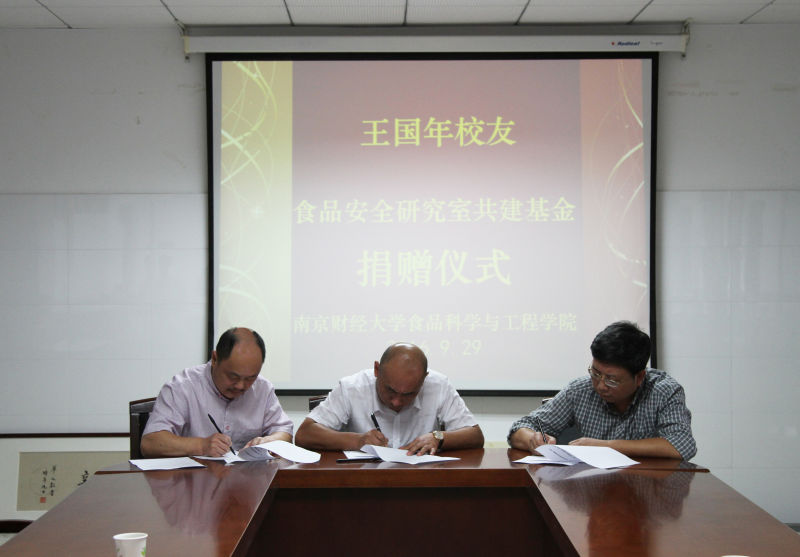 9月28、29日下午,原南京糧食經(jīng)濟(jì)學(xué)院糧油儲(chǔ)藏專(zhuān)業(yè)83級(jí)校友、僑基集團(tuán)董事長(zhǎng)曹昌銀捐贈(zèng)20萬(wàn)元,87級(jí)校友、上海鑫淳企業(yè)管理咨詢(xún)有限公司總經(jīng)理張力加捐贈(zèng)10萬(wàn)元設(shè)立獎(jiǎng)學(xué)獎(jiǎng)教基金,91級(jí)校友、安徽池州市九華船務(wù)有限公司董事長(zhǎng)王國(guó)年捐贈(zèng)10萬(wàn)元設(shè)立食品安全研究室共建基金。捐贈(zèng)儀式在仙林校區(qū)工科樓二樓會(huì)議室舉行。我院、校友會(huì)秘書(shū)處相關(guān)負(fù)責(zé)人以及部分學(xué)生代表參加捐贈(zèng)儀式。捐贈(zèng)儀式由我院黨委書(shū)記吳正浩主持。