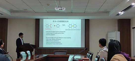 李光磊老師首先介紹了他在日本北海道大學(xué)的學(xué)習(xí)生活經(jīng)歷。接著,李老師介紹了通過(guò)鈴木-宮浦偶聯(lián)反應(yīng)獲得的BODIPY熒光材料及近紅外化學(xué)發(fā)光探針材料,其具有發(fā)光效率高、穩(wěn)定性好、毒性低等優(yōu)點(diǎn),可用于食品安全快速檢測(cè)。