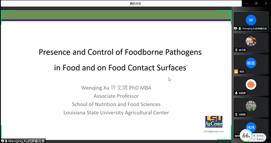 11月2日上午,應我院邀請,美國路易斯安那州立大學許文清副教授為我院師生作了題為《Presence and Control of Foodborne Pathogens in Food and on Food Contact Surfaces》的線上學術報告。食品科學與工程學院部分師生代表參加了本次報告會,報告會由食品科學與工程學院陸穎健教授主持召開。