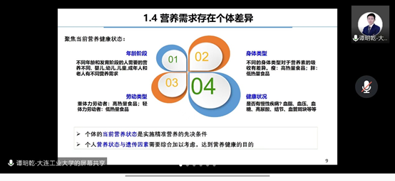 譚明乾教授首先從精準(zhǔn)營養(yǎng)的研究手段和干預(yù)手段介紹了精準(zhǔn)營養(yǎng)的背景,譚教授介紹精準(zhǔn)營養(yǎng)是在考察個(gè)體遺傳背景、生活特征、代謝指標(biāo)和腸道微生物等因素基礎(chǔ)上,經(jīng)大數(shù)據(jù)分析,進(jìn)行安全、高效個(gè)體化營養(yǎng)干預(yù),已達(dá)到維持機(jī)體健康、有效預(yù)防和控制疾病發(fā)生的目的,而精準(zhǔn)營養(yǎng)的目標(biāo)是防未病,治已病,讓更多亞健康及慢性疾病人群享受健康生活。西方醫(yī)學(xué)之父希波克拉底曾說過“讓食物成為你的藥品,而不要讓藥品成為你的食物”,如何利用食品科技保障人民營養(yǎng)健康,是我們面臨的一個(gè)重大課題。接著譚教授向我們介紹了自己的主要研究方向和成果,利用殼聚糖和果膠與藍(lán)莓花色苷自組裝制備花色苷穩(wěn)態(tài)化載體,提高了線蟲的抗丙烯酰胺、過氧化氫、熱應(yīng)激以及紫外照射損傷,延長壽命。最后譚教授介紹了精準(zhǔn)營養(yǎng)的產(chǎn)業(yè)發(fā)展動(dòng)態(tài)以及遇到的一些挑戰(zhàn),并指出基于食品功能因子靶向遞送的精準(zhǔn)營養(yǎng)研究是未來食品科技發(fā)展的重要方向,需要不斷加強(qiáng)基礎(chǔ)科學(xué)和關(guān)鍵技術(shù)研究,為生命健康提供科學(xué)依據(jù)和支撐。