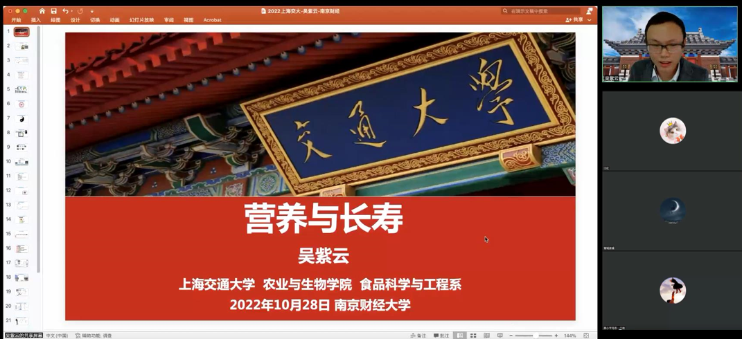 10月28日上午,國(guó)家優(yōu)青、上海交通大學(xué)長(zhǎng)聘教軌副教授、博士生導(dǎo)師吳紫云應(yīng)邀作了題為“營(yíng)養(yǎng)與長(zhǎng)壽”的學(xué)術(shù)報(bào)告,本次報(bào)告由食品科學(xué)與工程學(xué)院院長(zhǎng)方勇教授主持,學(xué)院300余名師生通過線上方式聆聽了報(bào)告。