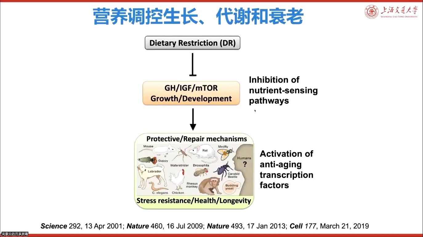 吳紫云副教授圍繞食品營(yíng)養(yǎng)影響衰老發(fā)生與發(fā)展的基礎(chǔ)科學(xué)問題,進(jìn)行了詳細(xì)闡述,通過探討飲食和長(zhǎng)壽之間的密切聯(lián)系,提出了目前抗衰老的干預(yù)措施主要包括飲食控制、減弱胰島素信號(hào)通路和減弱mTOR信號(hào)通路。隨后,通過介紹酵母衰老模型和線蟲衰老模型,引出了抗衰老在當(dāng)前和未來的一些前沿研究方向,接著重點(diǎn)給大家講解了線蟲飲食限制長(zhǎng)壽模型,詳細(xì)分析了飲食調(diào)控先天免疫和長(zhǎng)壽的機(jī)制,為今后長(zhǎng)壽膳食配方的設(shè)計(jì)開發(fā)提供了重要的理論基礎(chǔ)。