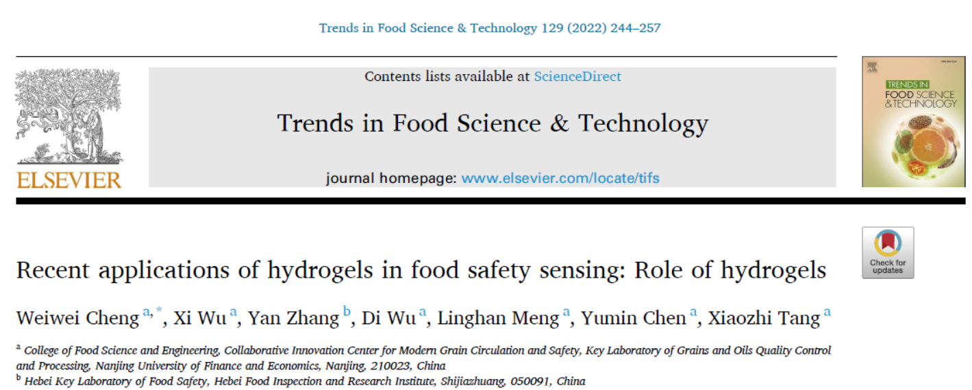 2022年10月9日,南京財經(jīng)大學(xué)食品科學(xué)與工程學(xué)院湯曉智湯曉智教授課題組與河北食品檢驗研究院張巖研究員聯(lián)合在食品國際頂尖學(xué)術(shù)刊物《Trends in Food Science & Technology》(Q1,IF=16.002)發(fā)表題為 “Recent applications of hydrogels in food safety sensing: Role of hydrogels” 的綜述論文。該論文以南京財經(jīng)大學(xué)為第一單位,程瑋瑋博士為第一作者。該項研究工作得到了國家重點研發(fā)計劃、江蘇省高等學(xué)校自然科學(xué)研究面上項目、南京市留學(xué)人員科技創(chuàng)新項目及江蘇省高校優(yōu)勢學(xué)科建設(shè)工程項目的資助。