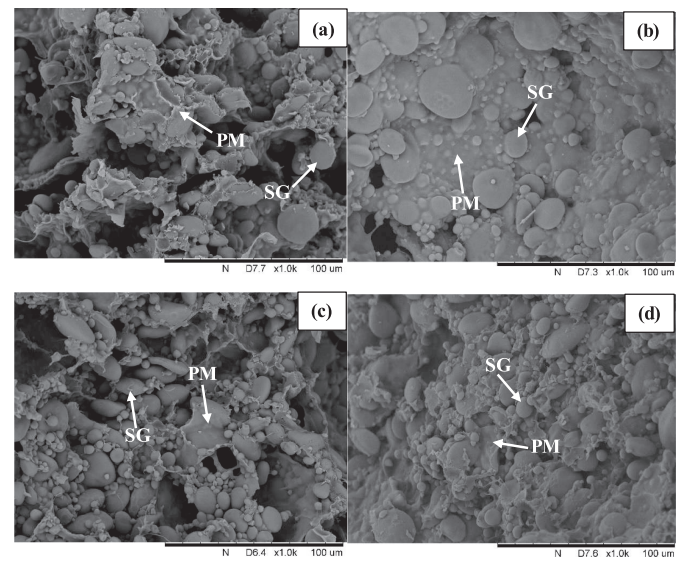 通過掃描電鏡觀察全麥面團(tuán)的微觀結(jié)構(gòu)得出,發(fā)現(xiàn)了親水膠體促進(jìn)全麥面團(tuán)形成連續(xù)面筋網(wǎng)絡(luò),并強(qiáng)化淀粉顆粒和蛋白質(zhì)分子之間作用。因此,親水膠體可應(yīng)用于調(diào)控全麥面團(tuán)的微觀結(jié)構(gòu),在改善全麥產(chǎn)品品質(zhì)方面發(fā)揮潛在作用。