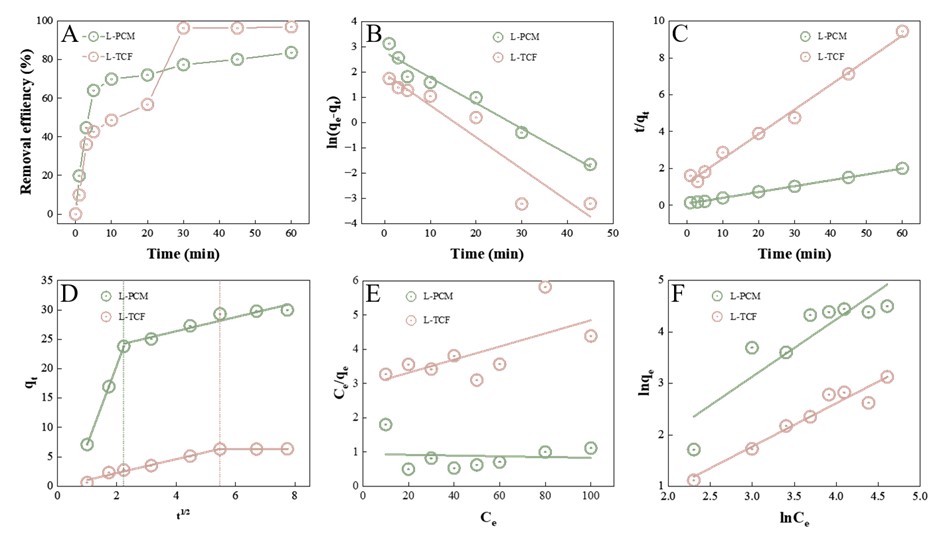 圖6 L-PCM 和L-TCF對Pb(II)的吸附行為分析:(A) 吸附時間對吸附效率的影響; 吸附動力學模型擬合:(B)準一級,(準)二級,(D)顆粒擴散模型;等溫吸附模型擬合:(E)Langmuir,(F)Freundlich