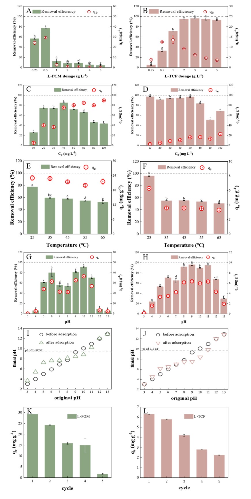 圖5 對Pb(II)吸附效率和吸附容量的影響。吸附劑用量:(A)L-PCM,(B)L-TCF;Pb(II)初始濃度:(C)L-PCM,(D)L-TCF;反應溫度:(E)L-PCM,(F)L-TCF;初始pH:(G)L-PCM,(H)L-TCF;溶液pH值變化:(I)L-PCM,(J)L-TCF;可回用性(K)L-PCM,(L)L-TCF