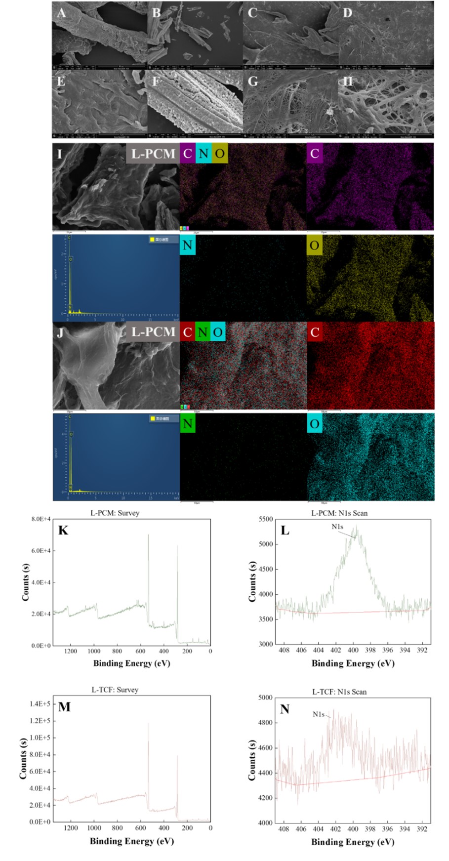 圖3 不同放大倍數(shù)下吸附劑的SEM;5k:(A)MCC,(B)L-PCM,(C)CNF,(D)L-TCF;5w:(E)MCC,(F)L-PCM,(G)CNF,(H)L-TCF。(I)L-PCM,(J)L-TCF的EDS能譜;XPS譜圖:(K)L-PCM全譜圖,(L)L-PCM N1s掃描圖,(M)L-TCF全譜圖,(N)L-TCF N1s掃描圖。