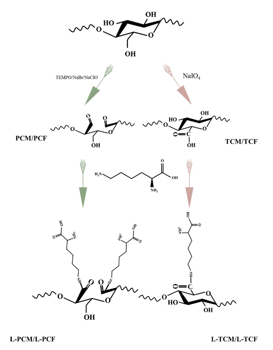 圖1 兩種氧化活化方法制備L-賴氨酸功能化纖維素基吸附劑的示意圖