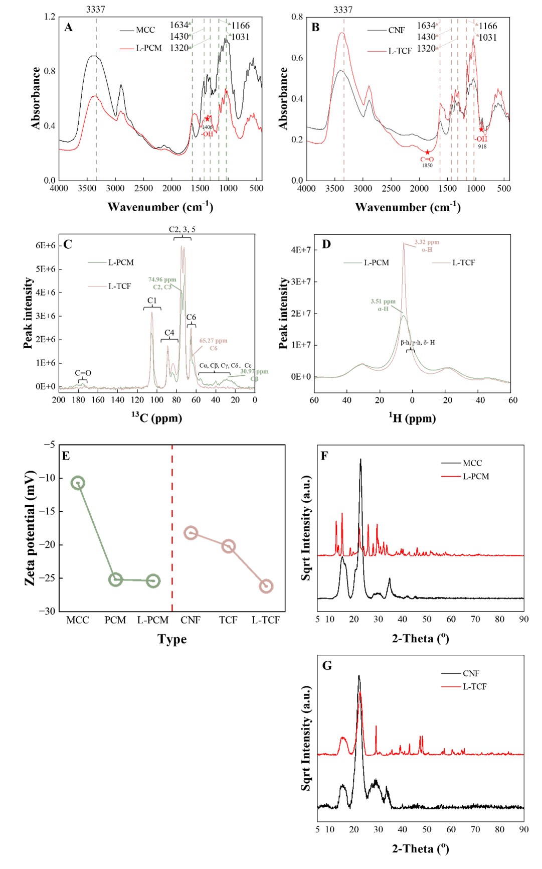 圖4 吸附劑的紅外光譜:(A)MCC和L-PCM,(B)CNF和L-TCF;L-PCM和L-TCF的核磁共振光譜:(C)13C,(D)1H;吸附劑的性質(zhì):(E)Zeta電位;(F)MCC和L-PCM的XRD圖譜;(G)CNF和L-TCF的XRD圖譜