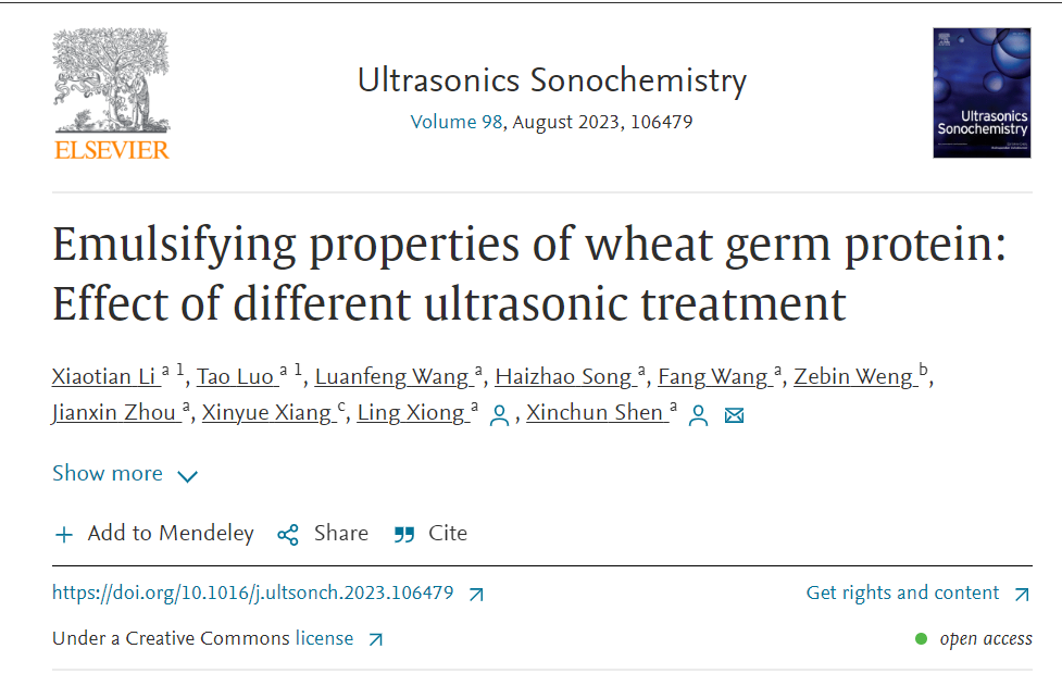 2023年8月1日,南京財(cái)經(jīng)大學(xué)食品科學(xué)與工程學(xué)院沈新春、熊玲(通訊作者)在國際TOP期刊Ultrasonics Sonochemistry(Q1,IF: 8.4)發(fā)表題為“Emulsifying properties of wheat germ protein: Effect of different ultrasonic treatment”的研究性論文。