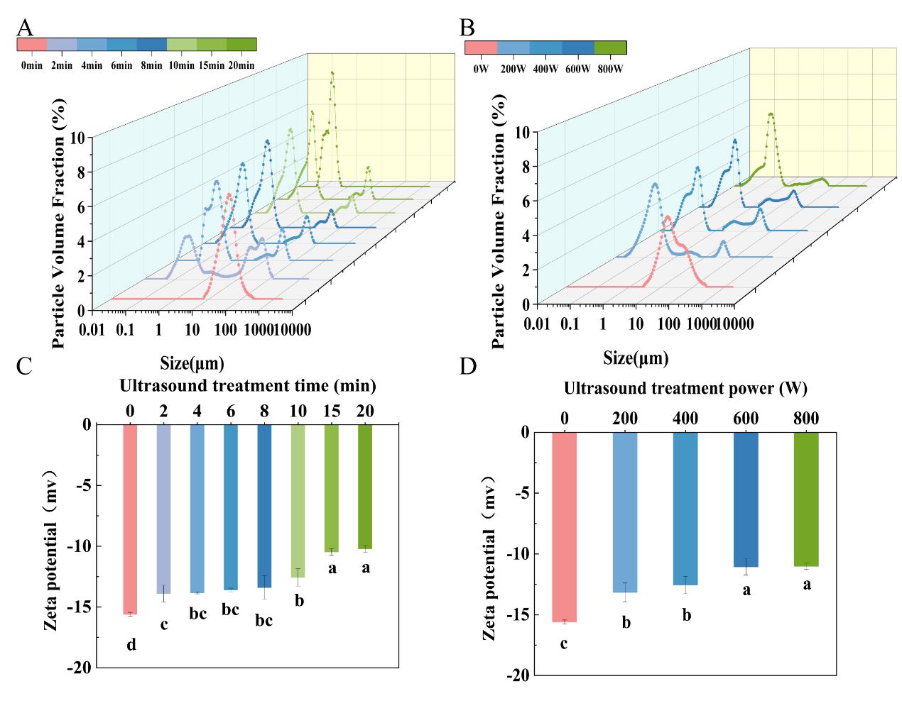 圖3 超聲處理后麥胚蛋白粒徑和電勢(shì)變化