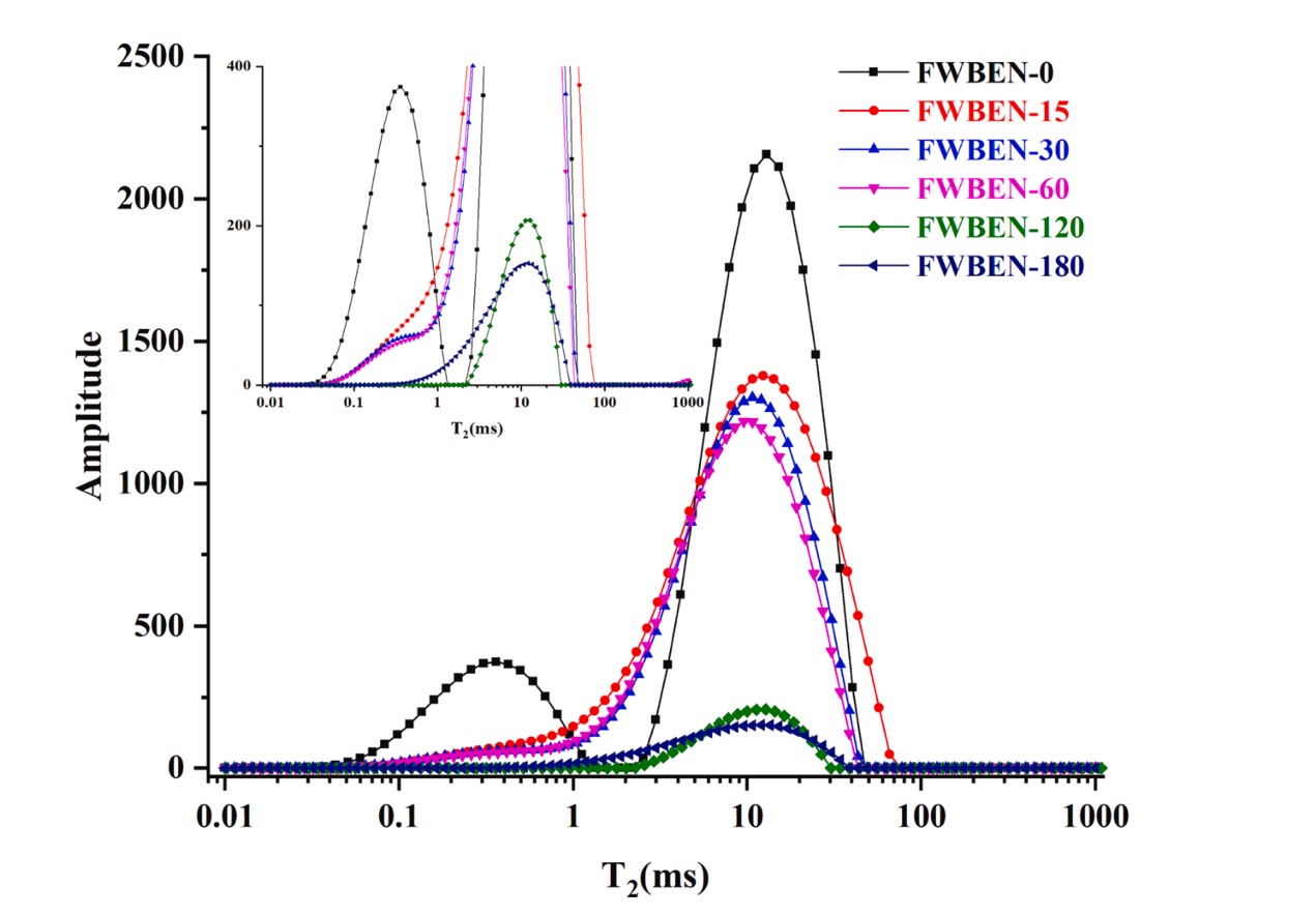 圖2 冷凍儲藏期間全蕎麥擠壓面條的水分分布;插圖為局部放大圖片