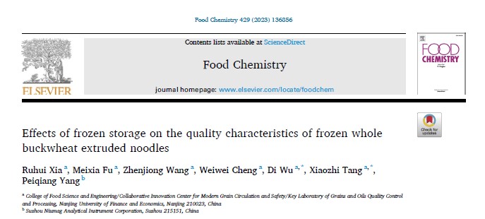 2023年7月13日,南京財經(jīng)大學食品科學與工程學院湯曉智、吳迪(通訊作者)在國際TOP期刊Food Chemistry(Q1,IF: 8.8)發(fā)表題為“Effects of frozen storage on the quality characteristics of frozen whole buckwheat extruded noodles”的研究性論文。