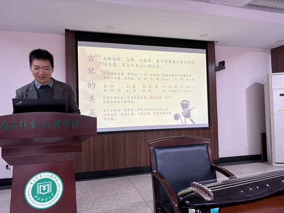 11月22日,“古琴進(jìn)校園”活動(dòng)在工科樓211會(huì)議室成功舉辦。此次活動(dòng)由食品科學(xué)與工程學(xué)院分團(tuán)委指導(dǎo), “漢韻琴社” 社團(tuán)主辦,旨在弘揚(yáng)中國(guó)傳統(tǒng)文化,提升學(xué)生對(duì)古琴藝術(shù)的認(rèn)知與興趣。此次活動(dòng)邀請(qǐng)了正聲琴社康云飛老師,通過(guò)講解、演奏和互動(dòng)體驗(yàn)等環(huán)節(jié)呈現(xiàn)了古琴這一古老藝術(shù)形式的獨(dú)特魅力,搭建起一座連接現(xiàn)代學(xué)子與傳統(tǒng)文化的橋梁。