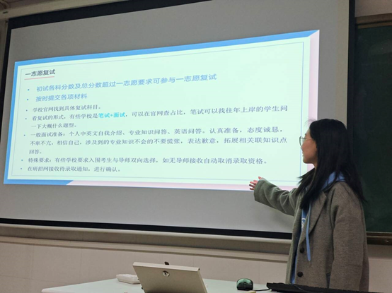 分享會(huì)上,任春柳同學(xué)圍繞復(fù)試全流程展開系統(tǒng)講解。在復(fù)試流程板塊,她梳理了從材料準(zhǔn)備、線上線下環(huán)節(jié)安排到錄取確認(rèn)的關(guān)鍵節(jié)點(diǎn);備考策略方面,強(qiáng)調(diào)依據(jù)學(xué)科特性定制復(fù)習(xí)計(jì)劃,重視學(xué)科前沿知識(shí)的積累;面試技巧分享中,通過(guò)個(gè)人實(shí)例指導(dǎo)同學(xué)們從儀容儀表、語(yǔ)言表達(dá)、問題應(yīng)答等細(xì)節(jié)展現(xiàn)綜合素養(yǎng);面對(duì)復(fù)試焦慮,她還分享了實(shí)用的心理調(diào)適方法,鼓勵(lì)同學(xué)們以沉穩(wěn)心態(tài)應(yīng)考。