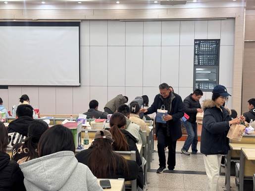 在溫馨融洽的氛圍中,學院領(lǐng)導與老師們親手將一份份精心準備的“考研加油包”送到學生手中。每份加油包內(nèi)不僅有實用的學習文具、緩解疲勞的睡眠眼罩等物資,還附有學弟學妹們親手寫下的祝福賀卡。字里行間承載著真摯的鼓勵與美好的期盼,成為這個冬日里一份特別的精神助力。