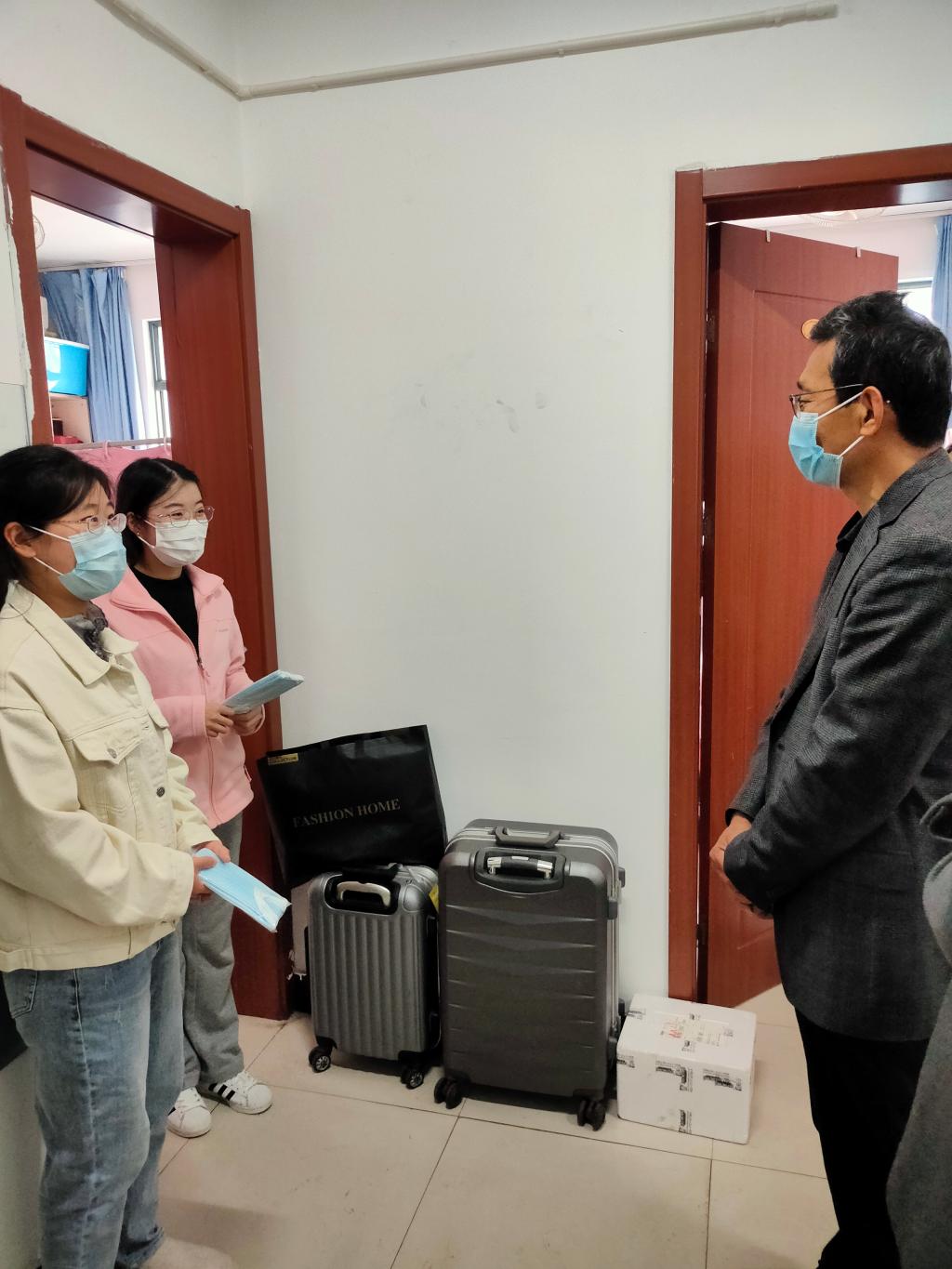 許文彪書記向在場的學(xué)生表達(dá)了學(xué)院的關(guān)心,贈送了學(xué)院為大家準(zhǔn)備的防護(hù)口罩,并叮囑大家要做好防疫防護(hù)工作,保護(hù)好自己的健康安全,學(xué)院會全心全意保障大家在校期間的學(xué)習(xí)生活,為大家營造一個安全、溫暖、舒適的校園生活環(huán)境。在校期間要保證身體、心理雙健康,珍惜校園穩(wěn)定安全的環(huán)境。周進(jìn)進(jìn)老師詳細(xì)了解我院學(xué)生當(dāng)前心理狀況、生活情況以及存在的困難,并叮囑他們注意自身防護(hù),確保身體健康,更好地適應(yīng)隔離生活,隔離期間正好也是提升自己的好時機(jī),要按時上課,完成學(xué)業(yè)任務(wù),嚴(yán)格遵守防控規(guī)定,為疫情防控做貢獻(xiàn)。
