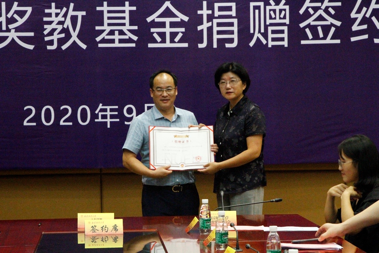 隨后,蔣望董事長和裴銀偉副處長、方勇副院長(主持工作)共同簽署捐贈協(xié)議,邱偉芬副校長代表學(xué)校向蔣望董事長頒發(fā)了捐贈證書。