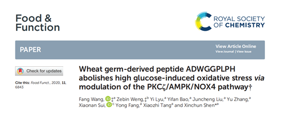 我院沈新春教授課題組采用獨(dú)特的二步雙酶酶解篩選技術(shù),從麥胚清蛋白中篩選出了高活性的抗氧化肽,用ESI-TOF MS/MS鑒定其結(jié)構(gòu)。并以高糖誘導(dǎo)的血管平滑肌細(xì)胞(VSMCs)和STZ誘導(dǎo)的糖尿病小鼠為模型,研究該抗氧化肽的抗氧化作用及機(jī)制。相關(guān)研究結(jié)果以“Wheat germ-derived peptide ADWGGPLPH abolishes high glucose-induced oxidative stress via modulation of the PKCζ/AMPK/NOX4 pathway”為題發(fā)表在Food & Function雜志上。我院汪芳副教授為第一作者,沈新春教授為通訊作者。本研究得到國(guó)家自然科學(xué)基金、江蘇省自然科學(xué)基金和江蘇省高校自然科學(xué)基金的支持。