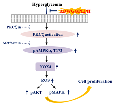 高血糖引起的葡萄糖自動(dòng)氧化、蛋白質(zhì)糖基化作用的增強(qiáng)及脂代謝異常是糖尿病患者體內(nèi)自由基,特別是ROS增加的主要原因,同時(shí)也導(dǎo)致一些抗氧化酶的活性明顯降低,從而使糖尿病患者體內(nèi)處于一定程度的氧化應(yīng)激狀態(tài)。氧化應(yīng)激不僅參與了糖尿病的發(fā)生、發(fā)展以及惡化的全部過程,而且參與了糖尿病并發(fā)癥的重要病理改變——多種器官的動(dòng)脈粥樣硬化。天然抗氧化肽由于安全,高效等特點(diǎn),可以作為抗氧化功能因子,開發(fā)成新型功能性食品。研究表明小麥胚芽蛋白酶解物具有抗氧化作用,然而,其活性抗氧化成分和體內(nèi)抗氧化機(jī)理尚未完全明了。本研究采用了獨(dú)特的二步雙酶酶解篩選技術(shù),從麥胚清蛋白中篩選出了高活性的抗氧化肽,用ESI-TOF MS/MS鑒定其結(jié)構(gòu)。并以高糖誘導(dǎo)的血管平滑肌細(xì)胞(VSMCs)和STZ誘導(dǎo)的糖尿病小鼠為模型,研究該抗氧化肽的抗氧化作用及機(jī)制。結(jié)果顯示該抗氧化肽氨基酸序列為AREGETVVPG,能通過激活PKC/AMPK信號(hào)通路抑制NOX4的表達(dá),降低細(xì)胞內(nèi)ROS生成,從而改善高糖誘導(dǎo)的VSMCs和糖尿病小鼠的氧化應(yīng)激狀態(tài)。膳食中添加抗氧化肽與現(xiàn)有的降糖藥相結(jié)合,可以作為一種輔助治療糖尿病血管并發(fā)癥的潛在手段。