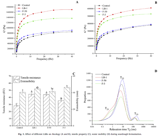 本團(tuán)隊(duì)研究結(jié)果研究表明,與其他乳酸菌相比,利用植物乳桿菌LB-1發(fā)酵的全麥面團(tuán)表現(xiàn)出更好的粘彈性、延展性和持水性,以及更有序的面筋二級結(jié)構(gòu)(比對照組高6.49%)。同時(shí),植物乳桿菌LB-1能顯著改善全麥面包的質(zhì)構(gòu)特性,促進(jìn)風(fēng)味物質(zhì)的形成,有效延長全麥面包商品貨架期。