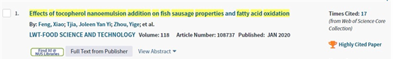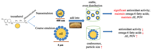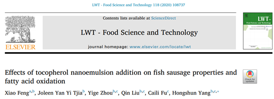 包埋維生素E的納米乳液在魚腸中的添加可以有效延緩魚肉腸內(nèi)油脂的氧化,并且對其中的不飽和脂肪酸起到保護(hù)作用。相比較而言,微米級的維E乳液添加對于魚腸的脂肪氧化并沒有顯著的抑制作用。納米乳液具有粒徑小、分布均勻且較穩(wěn)定的性質(zhì),促使維生素E發(fā)揮了顯著的抗氧化作用。與此同時(shí),研究發(fā)現(xiàn)納米乳液的添加并不影響魚腸的質(zhì)構(gòu)及色澤,可以廣泛應(yīng)用于食品工業(yè)生產(chǎn)中。相關(guān)研究結(jié)果以“Effects of tocopherol nanoemulson addition on fish sausage properties and fatty acid oxidation”為題發(fā)表在LWT雜志上,并入選農(nóng)業(yè)科學(xué)領(lǐng)域ESI高被引論文。我院馮瀟博士為第一作者,新加坡國立大學(xué)楊宏順教授為通訊作者。