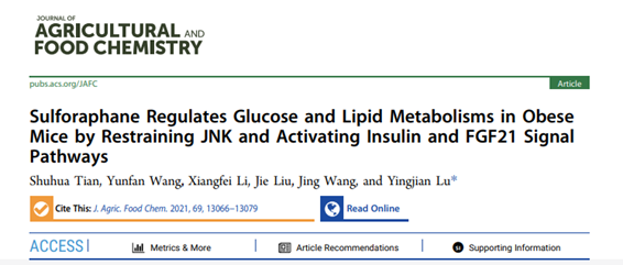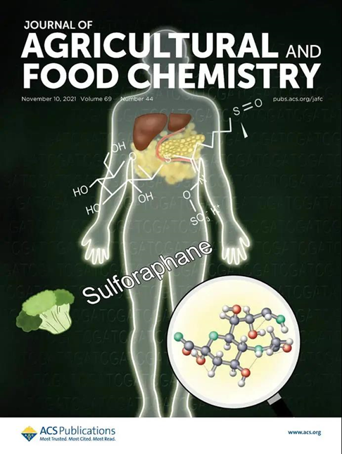 2021年10月28日,我院陸穎健教授團(tuán)隊(duì)在Journal of Agricultural and Food Chemistry第69刊發(fā)表封面文章《Sulforaphane regulates glucose and lipid metabolisms in obese mice by restraining JNK and activating insulin and FGF21 Signal pathways》。該論文以南京財(cái)經(jīng)大學(xué)為第一單位,田淑華為第一作者,陸穎健為通訊作者。