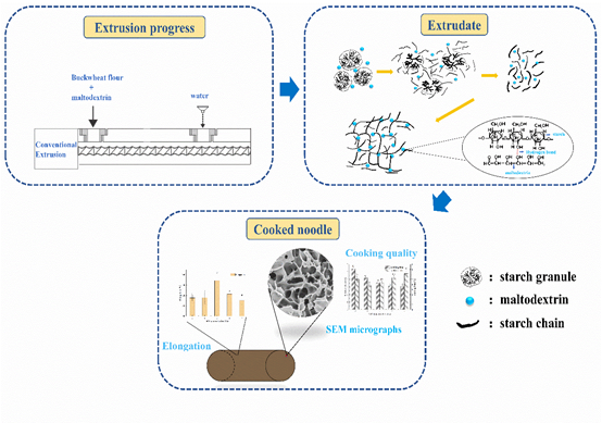 在本研究中,研究人員通過向蕎麥粉中添加水溶性麥芽糊精,經(jīng)過擠壓加工后成型制備蕎麥面條,利用麥芽糊精的高親水性構建水分輸送通道,同時利用麥芽糊精多羥基的分子結構增強蕎麥面條淀粉分子鏈的相對滑動性,既縮短了蕎麥面條的復熱時間和蒸煮損失,同時還增強了蕎麥面條的質構和拉伸品質。