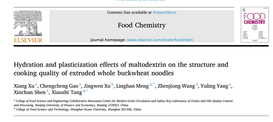 2021年11月16日,我院湯曉智教授課題組在《Food Chemistry》(一區(qū),IF=7.514)在線發(fā)表了題為“Hydration and plasticization effects of maltodextrin on the structure and cooking quality of extruded whole buckwheat noodles”的研究論文,該論文以南京財經(jīng)大學為第一單位,湯曉智教授和孟令晗博士為共同通訊作者。