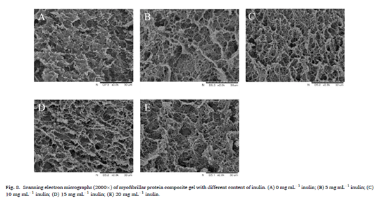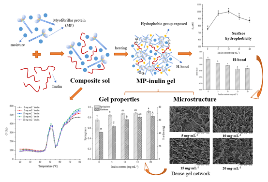 結果表明,添加5~20 mg/mL菊粉時MP-菊粉凝膠的彈性和硬度顯著增加,而添加5~10 mg/mL菊粉時,持水力(WHC)顯著增強(P<0.05)。改善MP混合凝膠性能的最適菊粉添加量為10 mg/mL。添加20 mg/mL菊粉可降低混合凝膠的蒸煮損失。菊粉中螺旋結構的疏水中心誘導更多的MP疏水基團暴露,從而增強了MP分子之間的疏水相互作用。添加菊粉減少了總巰基含量,促進凝膠中MP分子二硫鍵的形成。添加菊粉顯著降低拉曼光譜中I850/I830,菊粉的添加加強了MP分子間的氫鍵作用,菊粉的羥基可以與MP的羥基形成氫鍵。然而,菊粉對MP分子之間的靜電相互作用幾乎沒有影響。在加熱過程中,在凝膠形成和強化階段添加15 mg/mL菊粉的MP樣品具有最高的儲能模量(G')。當菊粉添加量超過10 mg/mL時,肌球蛋白的變性焓(ΔH)值降低,但不影響其變性溫度。微觀結構表明,含10 mg/mL菊粉的MP復合凝膠具有致密均勻的網(wǎng)絡結構。