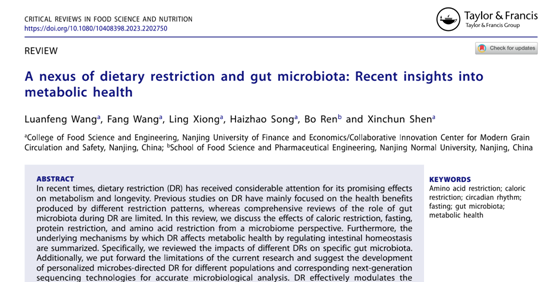 2023年5月8日,南京財經(jīng)大學食品科學與工程學院沈新春教授團隊與南京師范大學食品與制藥工程學院青年教師在國際食品領域頂級期刊《Critical Reviews in Food Science and Nutrition》(中科院1區(qū)TOP期刊,IF=11.208)上發(fā)表題為“A nexus of dietary restriction and gut microbiota:Recent insights into metabolic health”的綜述論文,全面闡述了基于代謝健康調(diào)控的不同飲食限制模式與腸道菌群之間的關系。