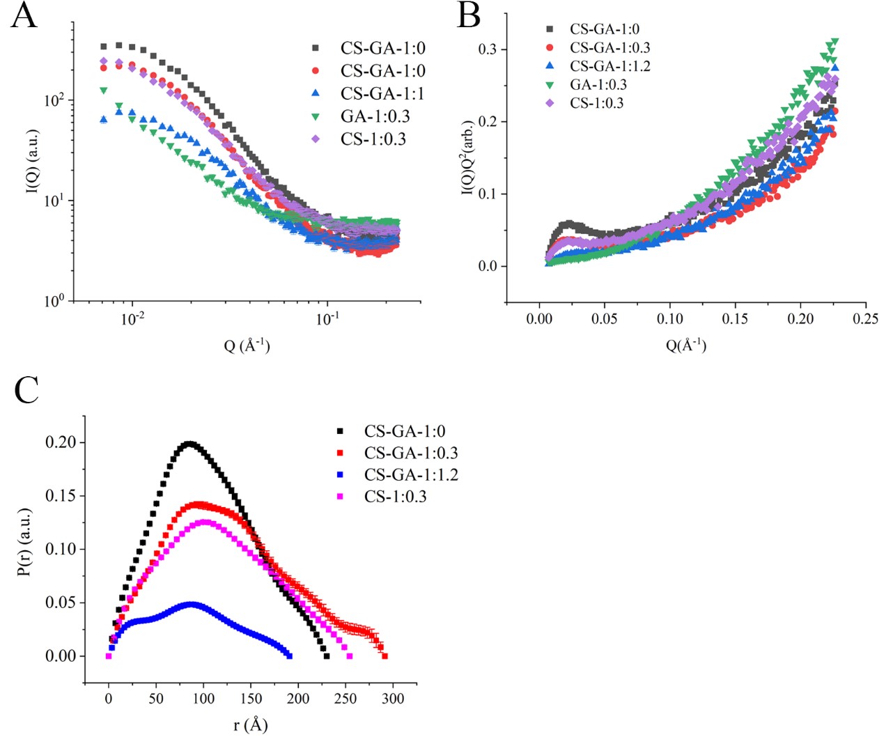 圖4 復(fù)合納米顆粒的小角X射線散射強(qiáng)度曲線 (A),Kratky plot (B) and PDDF (C)