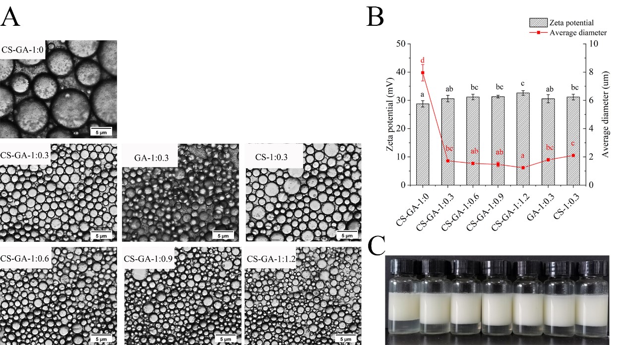 圖5 復(fù)合納米顆粒穩(wěn)定的乳液的光學(xué)顯微圖 (A), 平均粒徑和Zeta電位 (B), 儲(chǔ)存3天后的外觀圖 (C) ,(C: 從左到右 CS-GA-1: 0, CS-GA-1: 0.3, CS-GA-1: 0.6, CS-GA-1: 0.9, CS-GA-1: 1.2, GA-1:0.3, CS-1:0.3)
