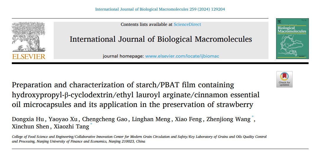2024年1月,南京財經(jīng)大學(xué)食品科學(xué)與工程學(xué)院湯曉智、汪振炯在期刊INTERNATIONAL JOURNAL OF BIOLOGICAL MACROMOLECULES(Q1,IF: 8.2)發(fā)表題為“Preparation and characterization of starch/PBAT film containing hydroxypropyl-β-cyclodextrin/ethyl lauroyl arginate/cinnamon essential oil microcapsules and its application in the preservation of strawberry”的研究性論文。