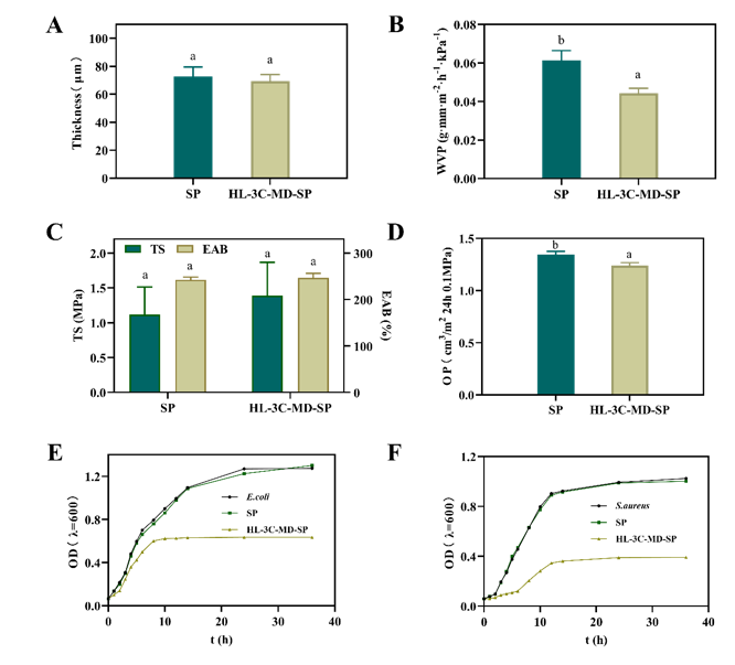 Fig. 5. A: Thickness of films; B: Water vapor permeability (WVP); C: Elongation at break (EAB); D: Oxygen permeability (OP); Antibacterial growth curve of films against E. coli (E) and S. aureus (F). Different lowercase letters indicate significant differences (p < 0.05).